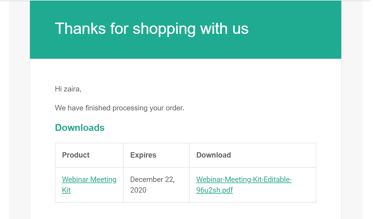 Al hacer la orden y enviar el pago, la tienda te dará acceso de inmediato al kit digital por email. Recibirás un email como este. Lo único que debes hacer es presionar el link en la columna de Download.